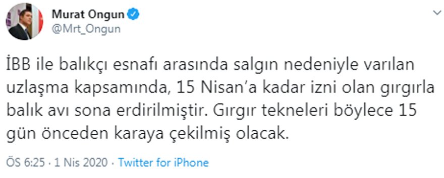 İBB Sözcüsü Murat Ongun, Twitter hesabından yaptığı açıklamada “İBB ile balıkçı esnafı arasında salgın nedeniyle varılan uzlaşma kapsamında, 15 Nisan'a kadar izni olan gırgırla balık avı sona erdirilmiştir” dedi.