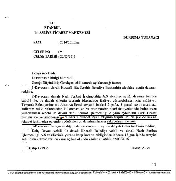 "Sayın Basın Mensubu, İstanbul Deniz Otobüsüleri San. ve Tic. A.Ş. (İDO) ile Narlı Feribot İşletmeciliği A.Ş. (Negmar - İstanbul Lines) arasında, İstanbul 14. Asliye Ticaret Mahkemesi’nde görülen Haksız Rekabet davasının 22 Mart 2016 tarihindeki Karar Duruşması’ndan çıkan kararı, ekte sizinle de paylaşıyoruz. Negmar tarafından, “İDO, kararı çarpıtıyor” şeklinde ortaya atılan iddiaları, takdirinize bırakıyoruz"