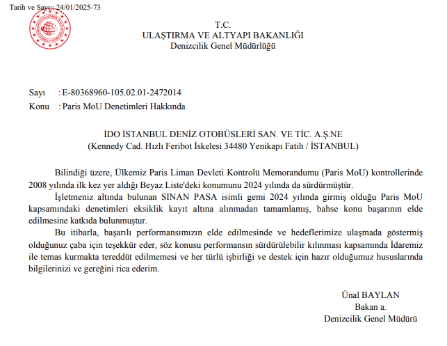Ulaştırma ve Altyapı Bakanlığı’na bağlı Denizcilik Genel Müdürlüğü, Sinan Paşa Gemisi’nin bu başarısından dolayı İDO’ya resmi bir teşekkür mesajı gönderdi. Söz konusu belgede, geminin 2024 Paris MoU kapsamındaki incelemelerde herhangi bir eksiklik ya da uygunsuzluk kaydı olmaksızın süreci tamamladığı vurgulandı. Bakanlık, bu performansın hem Türkiye’nin prestijini artırdığını hem de hedeflere ulaşma konusunda önemli bir rol oynadığını belirtti. Aynı zamanda denizcilik faaliyetlerinin sürdürülebilir biçimde devam etmesi için de iş birliğinin güçlendirileceği mesajını verdi.