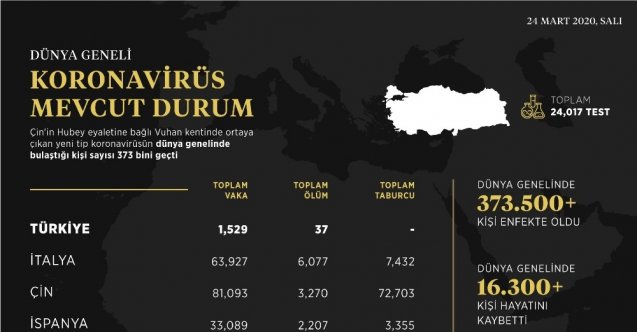 Başkanlığın yayımladığı verilere göre, dünya genelinde korona virüsün bulaştığı kişi sayısının 373 bini geçtiği, 16 bin 300’den fazla kişinin hayatını kaybettiği ve 101 bin 500’den fazla kişinin de iyileştiği yer aldı.