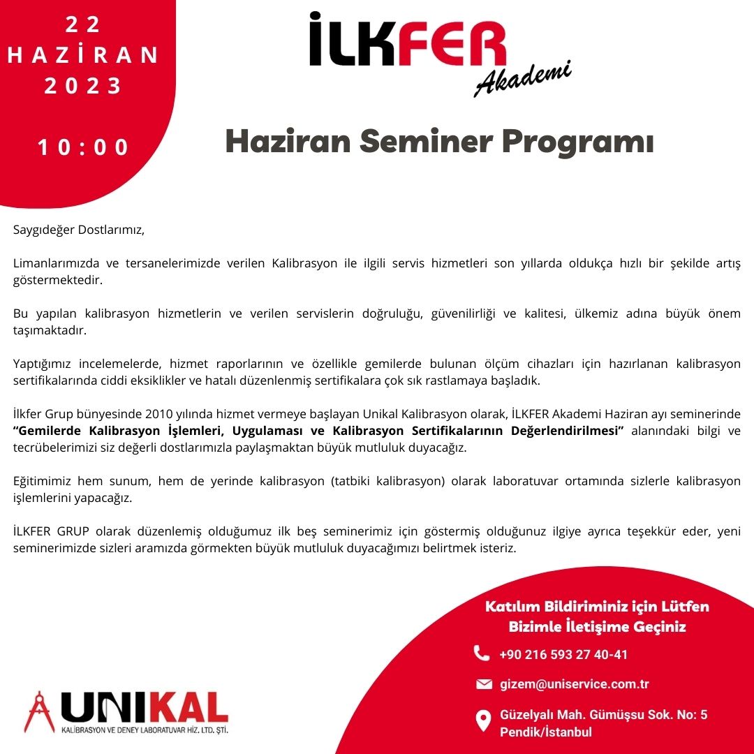 İlkfer Akademi'nin Haziran ayı seminerinde, ‘Gemilerde kalibrasyon işlemleri , uygulaması ve kalibrasyon sertifikalarının değerlendirilmesi' alanındaki bilgi ve tecrübelerini aktaracak.