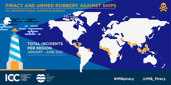 Uluslararası Denizcilik Bürosu (IMB)'nun yıl ortası güncellemesine göre, 2020'nin ilk yarısında gemilere ve mürettebatlarına yönelik şiddetli saldırıları yüzde 20 arttı. Rapor, Singapur Boğazı, Endonezya, Latin ve Güney Amerika'daki olayları incelerken, Batı Afrika dışındaki Gine Körfezi, giderek artan sayıdaki tehlikeli saldırılar ile ticari nakliye için en tehlikeli bölge olarak belirtiliyor.