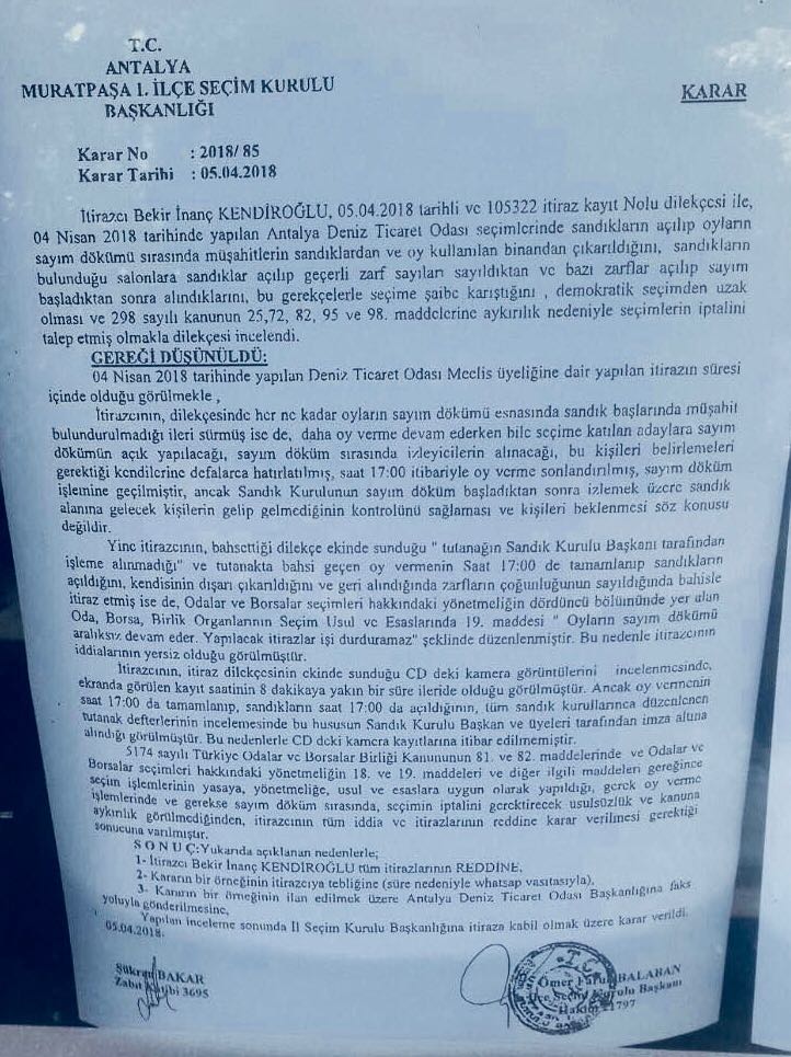İMEAK DTO Antalya Şubesi başkanlık seçiminin iptali için İlçe Seçim Kurulu'na başvurulmuştu. İlçe Seçim Kurulu yapılan başvuruyu reddetti.