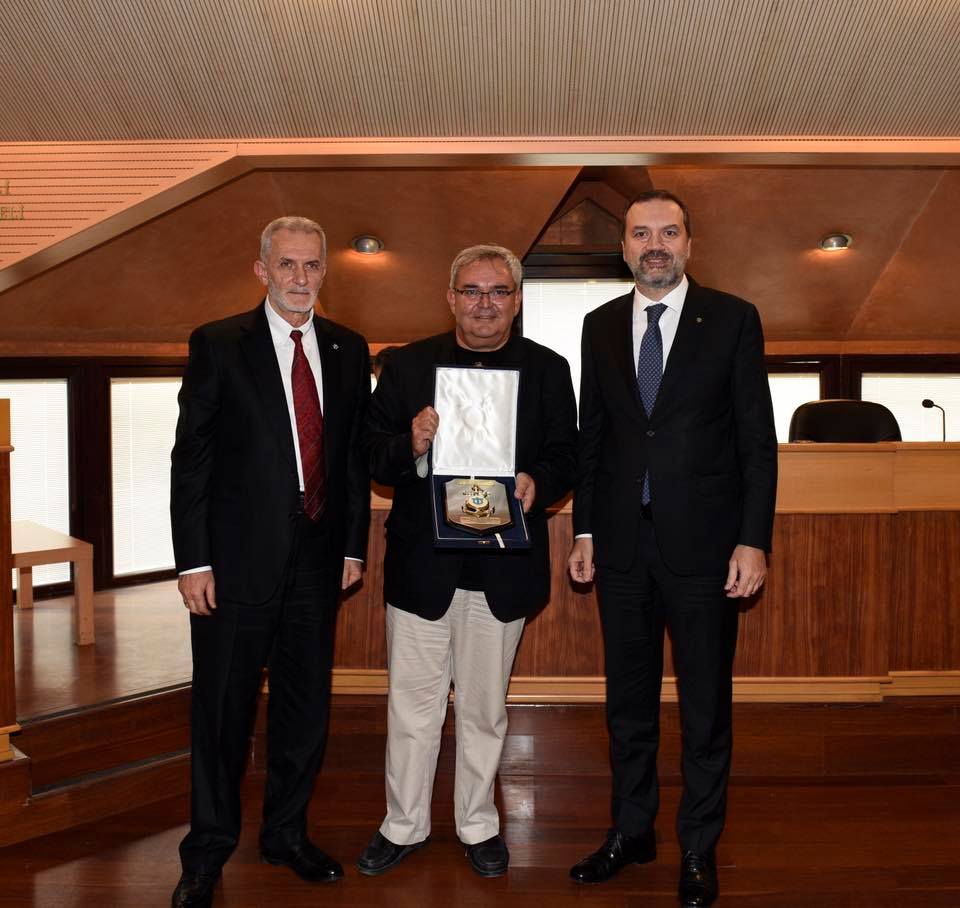 Konuşmasından sonra, Prof. Dr. Güven Sak'a İMEAK DTO Yönetim Kurulu Başkanı Tamer Kıran ve Meclis Başkanı Salih Zeki Çakır tarafından plaket takdim edildi.