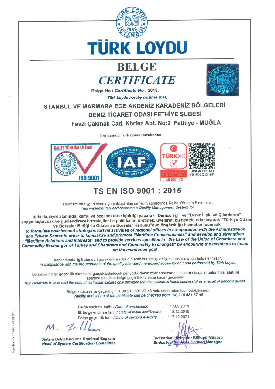 2015 yılından bu yana Kalite Yönetim Sisteminin ISO9001:2008 versiyonu ile Türk Denizciliğine ve sektöre hizmet veren İMEAK Deniz Ticaret Odası Fethiye Şubesi, kalite yönetim sistemine entegre olan ilk şube olmuştu.