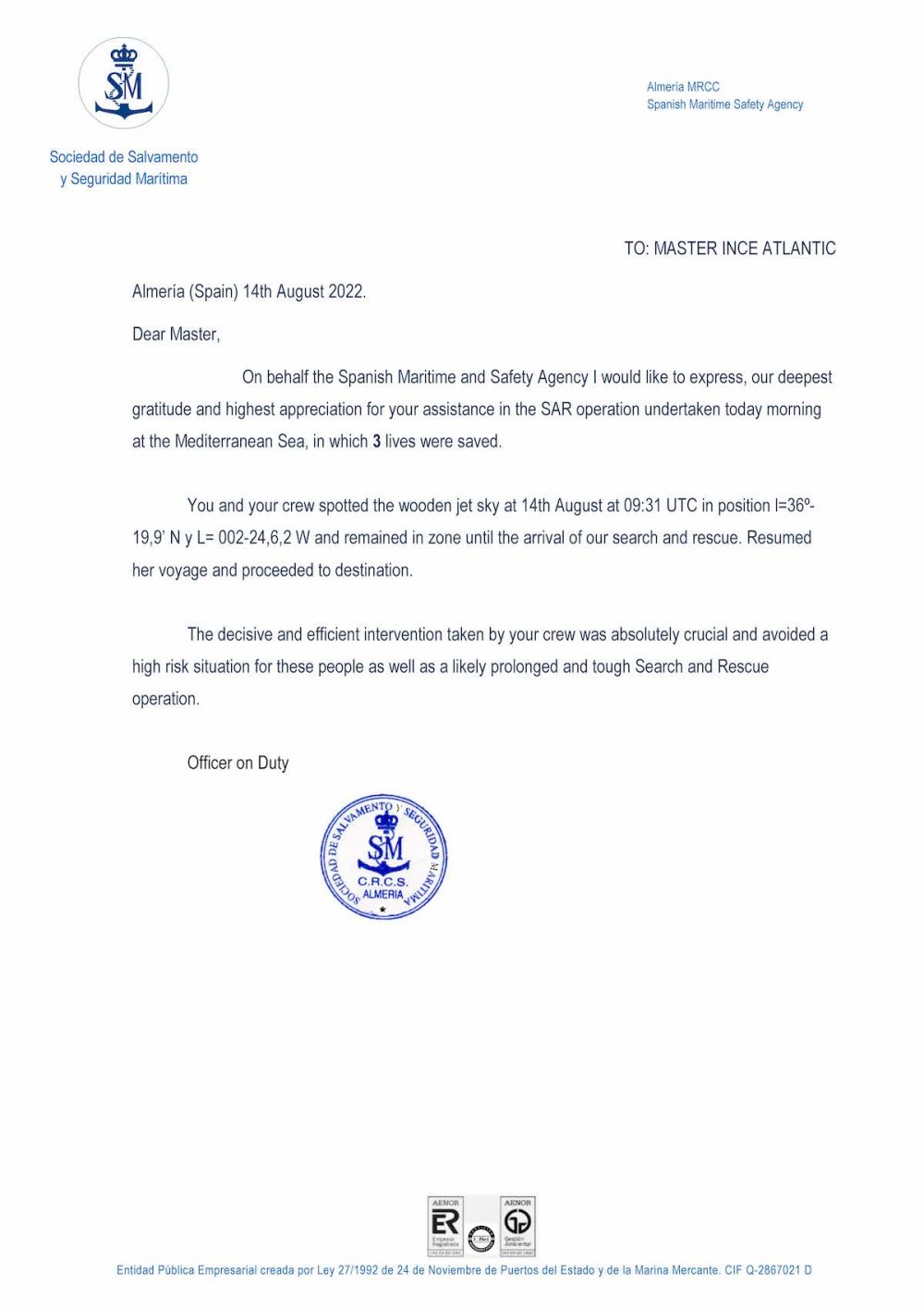 Akdeniz'de 3 kişinin hayatının kurtarıldığı Arama-Kutarma (SAR) operasyonunda İspanyol makamlarına destek olan İnce Atlantik gemisine İspanya'dan teşekkür geldi.