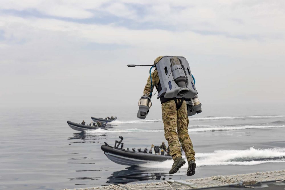 Komandoların baskın, arama ve el koyma operasyonlarında kullanılan tipik yöntemin bir helikopterden sarkıtılan halat veya hafif halat merdiveni kullanmak olduğu bilinmekte. Kraliyet Donanması'nın en son jetpack testinde ise bir Kraliyet Denizcisi, zodyak botun pruvasındaki özel bir platformdan havalanarak HMS Tamar isimli savaş gemisinin kırlangıç kısmına uçtu. Gemiye bindikten sonra, diğer askerlerin hızlıca gemiye çıkması için bir merdiven konuşlandırdı. Uçuş operasyonu sakin hava koşullarında gerçekleştirildi ve kalkıştan inişe kadar yaklaşık 15 saniye sürdü. Üretici Gravity Industries denemeyi videoya aldı.
