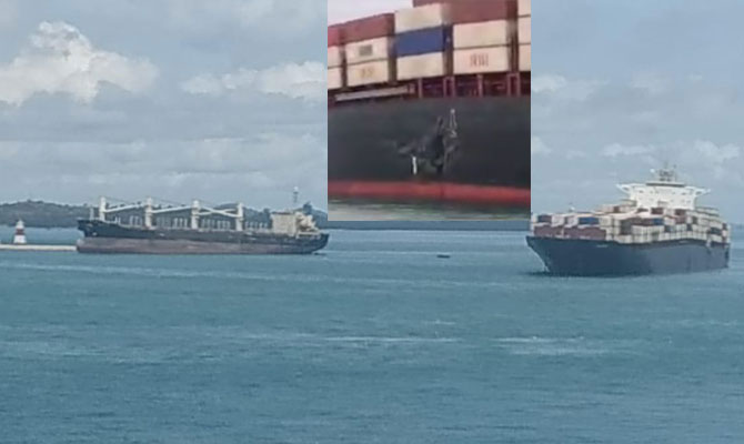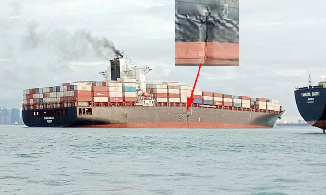 GÜNCELLEME 11 Mayıs 11:00 UTC: Karaya oturmuş gemilerin yanından geçen bir geminin kaptanından gelen fotoğraflara ulaşıldı, açıkça bir yarık görülüyor, konteyner gemisi iskele tarafındaki büyük çatlak ile ihlaller yapıyor.