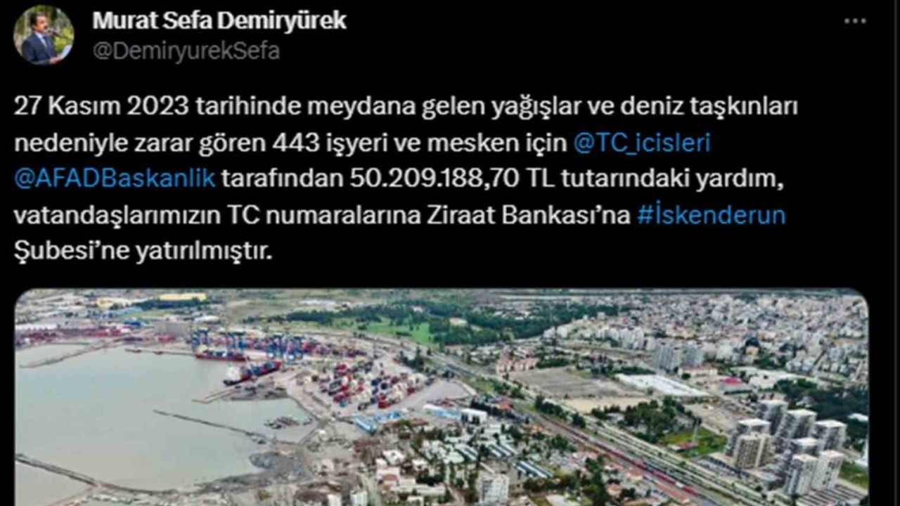 İskenderun Kaymakamı Demiryürek, sosyal medya hesabından yaptığı açıklamada, "27 Kasım 2023 tarihinde meydana gelen yağışlar ve deniz taşkınları nedeniyle zarar gören 443 işyeri ve mesken için İçişleri Bakanlığı, AFAD Başkanlığı tarafından 50 milyon 209 bin 188,70 TL tutarındaki yardım, vatandaşlarımızın TC numaralarına Ziraat Bankası İskenderun Şubesi’ne yatırılmıştır” ifadelerini kullandı.
