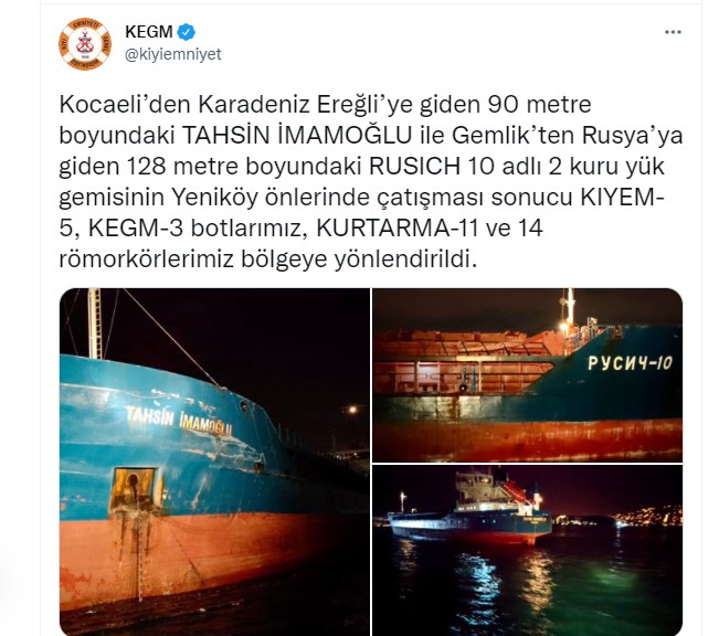 Kocaeli’den Karadeniz Ereğli’ye giden 90 metre boyundaki TAHSİN İMAMOĞLU ile Gemlik’ten Rusya’ya giden 128 metre boyundaki RUSICH 10 adlı kuru yük gemileri Yeniköy önlerinde çarpıştı.