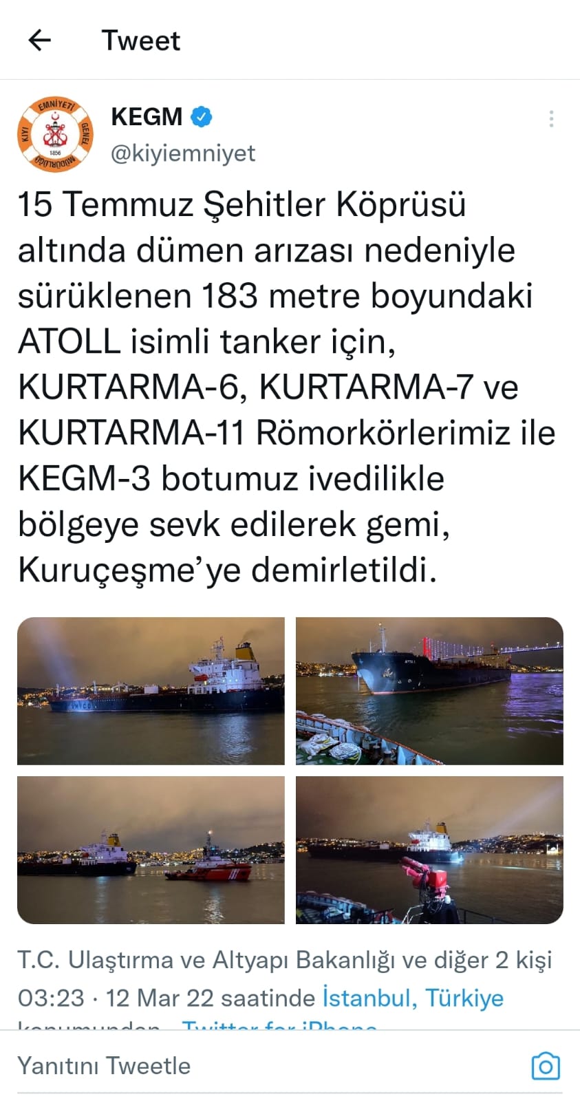 Kıyı Emniyeti Genel Müdürlüğü'nün sosyal medya hesabından yapılan açıklamada, “15 Temmuz Şehitler Köprüsü altında makine arızası nedeniyle sürüklenen 183 metre boyundaki ATOLL isimli tanker için, KURTARMA-6, KURTARMA-7 ve KURTARMA-11 Römorkörlerimiz ile KEGM-3 botumuz ivedilikle bölgeye sevk edilerek gemi Kuruçeşme’ye demirletildi” ifadeleri kullanıldı.