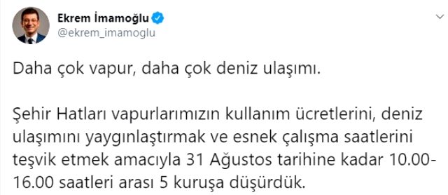 İstanbul Büyükşehir Belediye Başkanı Ekrem İmamoğlu, söz konusu gelişme hakkında sosyal medya üzerinden bir açıklama yaparak, "Daha çok vapur, daha çok deniz ulaşımı. Şehir hatları vapurlarımızın kullanım ücretlerini, deniz ulaşımını yaygınlaştırmak ve esnek çalışma saatlerini teşvik etmek amacıyla 31 Ağustos tarihine kadar 10.00-16.00 saatleri arası 5 kuruşa düşürdük" dedi.