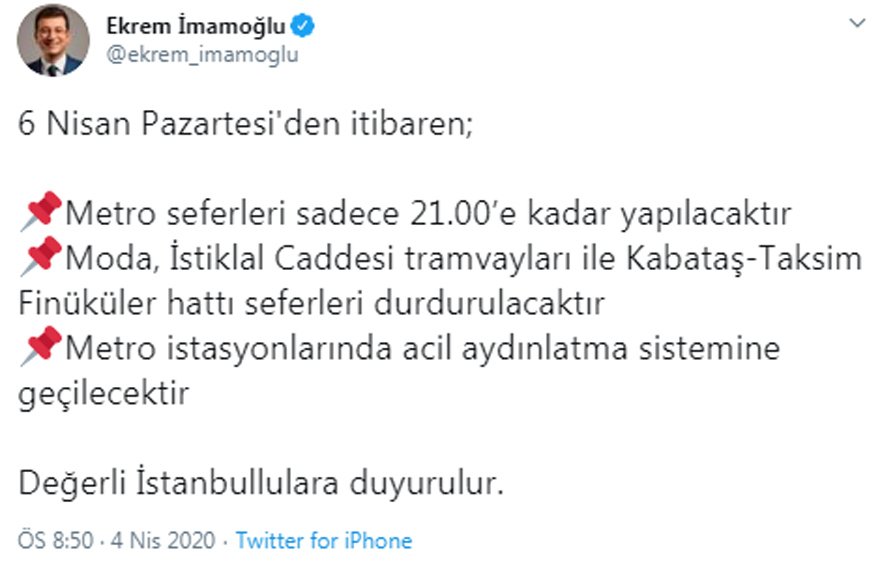 Metro seferlerinin 6 Nisan Pazartesi’den itibaren 06:00 – 21.00 saatleri arasında yapılacağını açıklayan Ekrem İmamoğlu, diğer kararlar ile ilgili şunları yazdı: