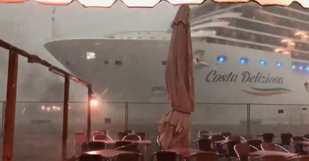 İtalya’nın Venedik şehrinde fırtına nedeniyle sürüklenen yolcu gemisi restorana çarpmaktan kıl payı kurtuldu.