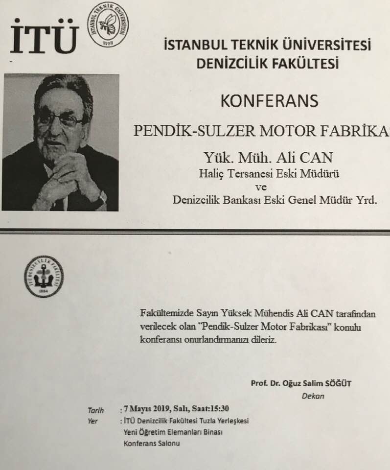 İTÜ Denizcilik Fakültesinde, "Pendik- Sulzer Motor Fabrikası" konulu konferans düzenleniyor. Haliç Tersanesi Eski Müdürü ve Denizcilik Bankası Eski Müdrür Yard. Yüksek Müh. Ali Can tarafından verilecek konferans , 07 Mayıs saat 15;30 tarihinde, Denizcilik Fakültesi Tuzla Kompleksi Yeni Öğretim Elemanları Binasında gerçekleşecektir.