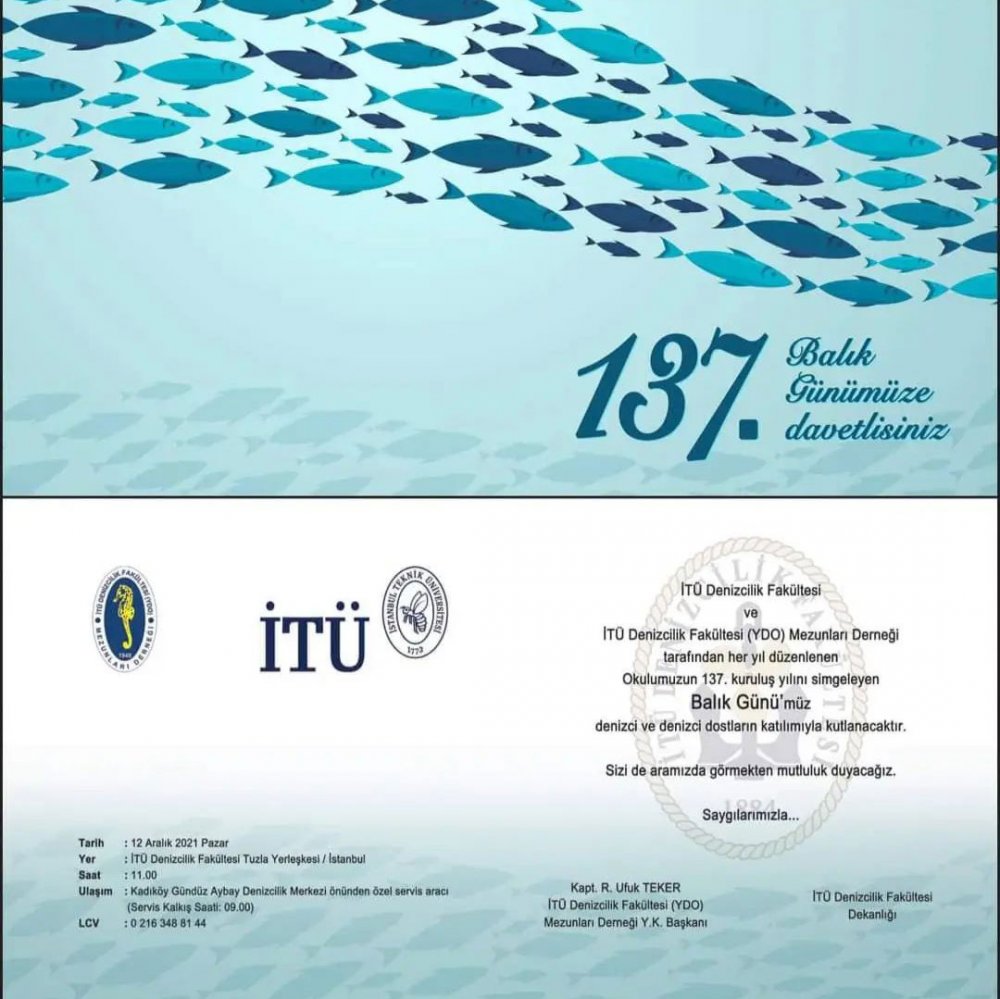 “Bu sene okulumuzun 137. kuruluş yılını simgeleyecek olan geleneksel “BALIK GÜNÜ” 12 Aralık 2021 Pazar günü saat 11:00’de İTÜ Denizcilik Fakültesi Tuzla Yerleşkesinde coşkuyla kutlanacaktır.