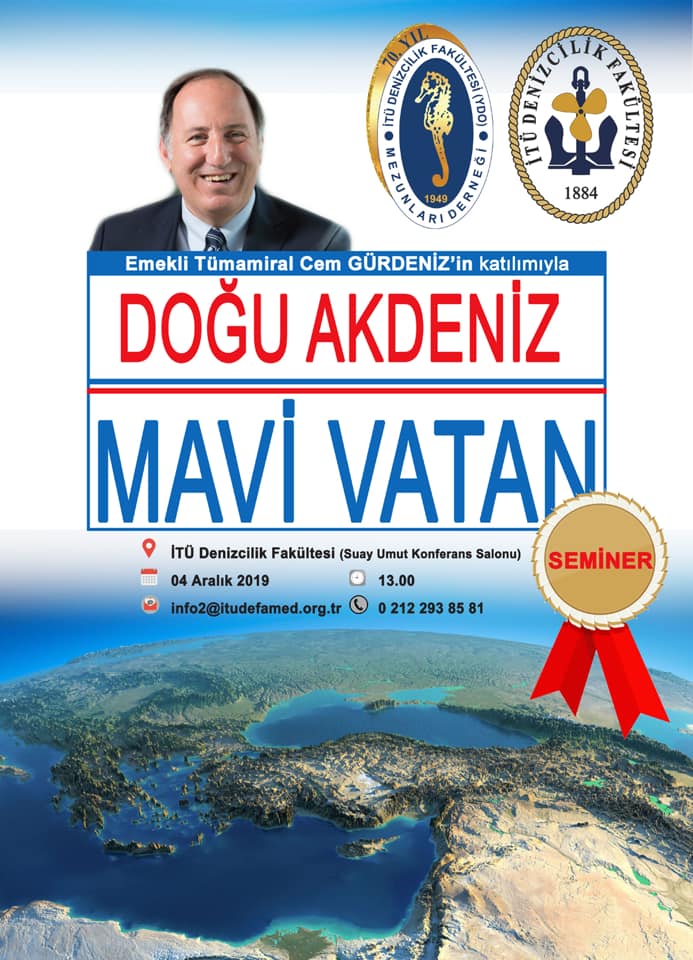 İTÜ Denizcilik Fakültesi ve DEFAMED'in ganizasyonuyla 4 Aralık 2019 tarihinde İTÜ Denizcilik Fakültesi Suay Umut Konferans Salonunda "Doğu Akdeniz / Mavi Vatan" konulu seminer düzenlenecektir.