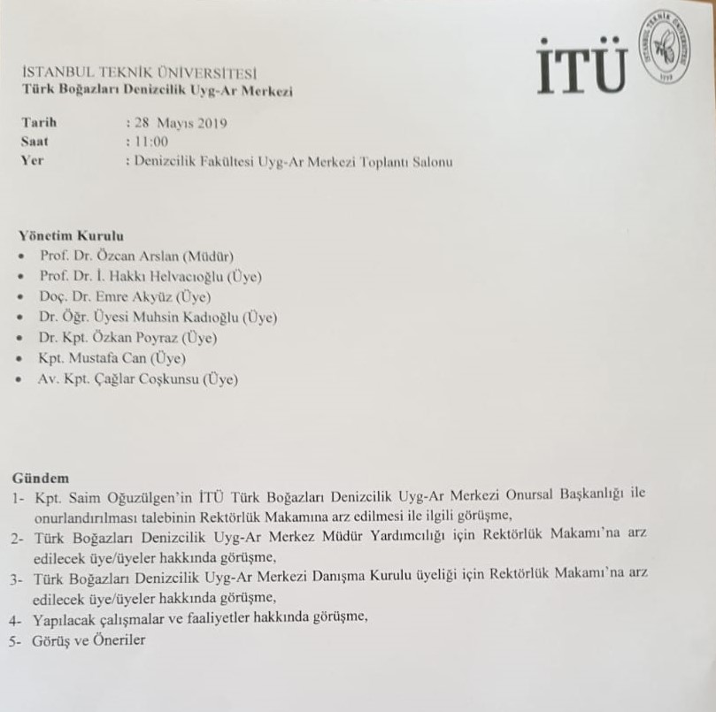 25 Şubat 2019 tarihinde, İstanbul Teknik Üniversitesi Rektörlüğüne bağlı olarak kurulan İstanbul Teknik Üniversitesi Türk Boğazları Denizcilik Uygulama ve Araştırma Merkezi İlk Toplantısını Yaptı