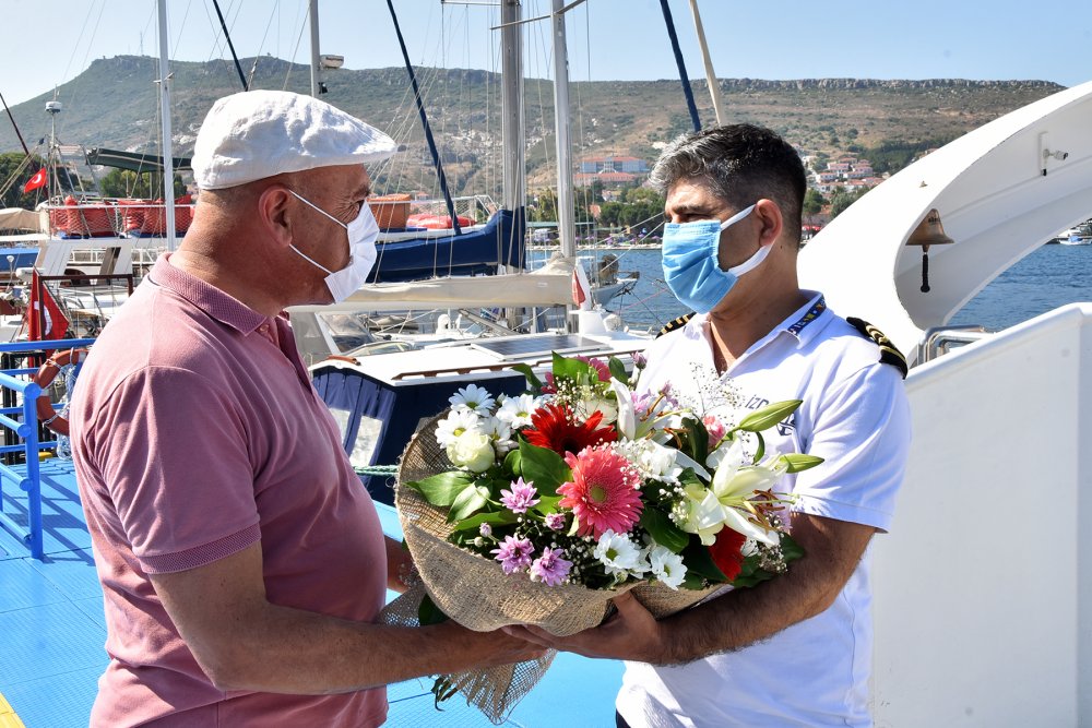 Foça İskeleye inen yolculara Hoş geldiniz diyen Başkan Yardımcısı Göksel Acar, Kaptan Hamit Doğruöz’e teşekkür çiçeği sundu.
