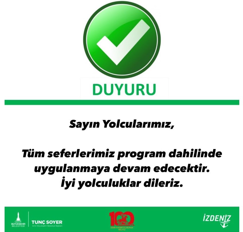 İZDENİZ’den yapılan açıklamada, "Tüm seferlerimiz program dahilinde uygulanmaya devam edecektir. İyi yolculuklar dileriz” ifadelerine yer verildi.