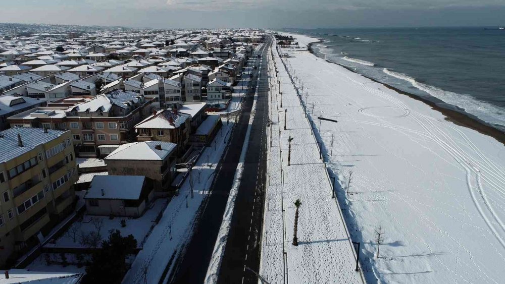 Sakarya'nın Karasu ilçesi yoğun kar yağışı nedeniyle beyaza bürünmüştü. Günlerdir beyaz görüntüsünü koruyan Karasu'da kar ve denizin buluşması havadan görüntülendi.