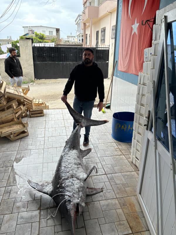 Karataş ilçesinden Akdeniz açıklarında avlanmak için açılan balıkçı Bahri Gayır’ın ağına sabah 3 metre boyunda kılıç balığı takıldı. Gayır, teknesine güçlükle aldığı balığı Karataş Balıkçı Barınağı’na getirdi.
