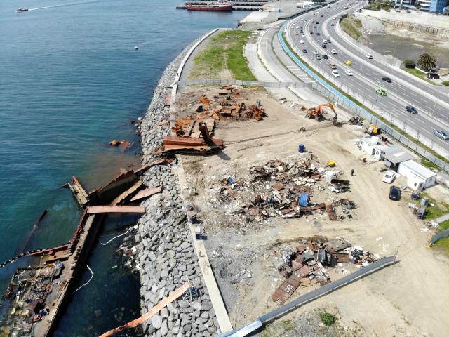 Zeytinburnu'nda fırtına nedeniyle kıyıya vuran geminin parçalanma işlemleri devam ediyor. Büyük bir bölümü parçalanan geminin son hali havadan görüntülendi.