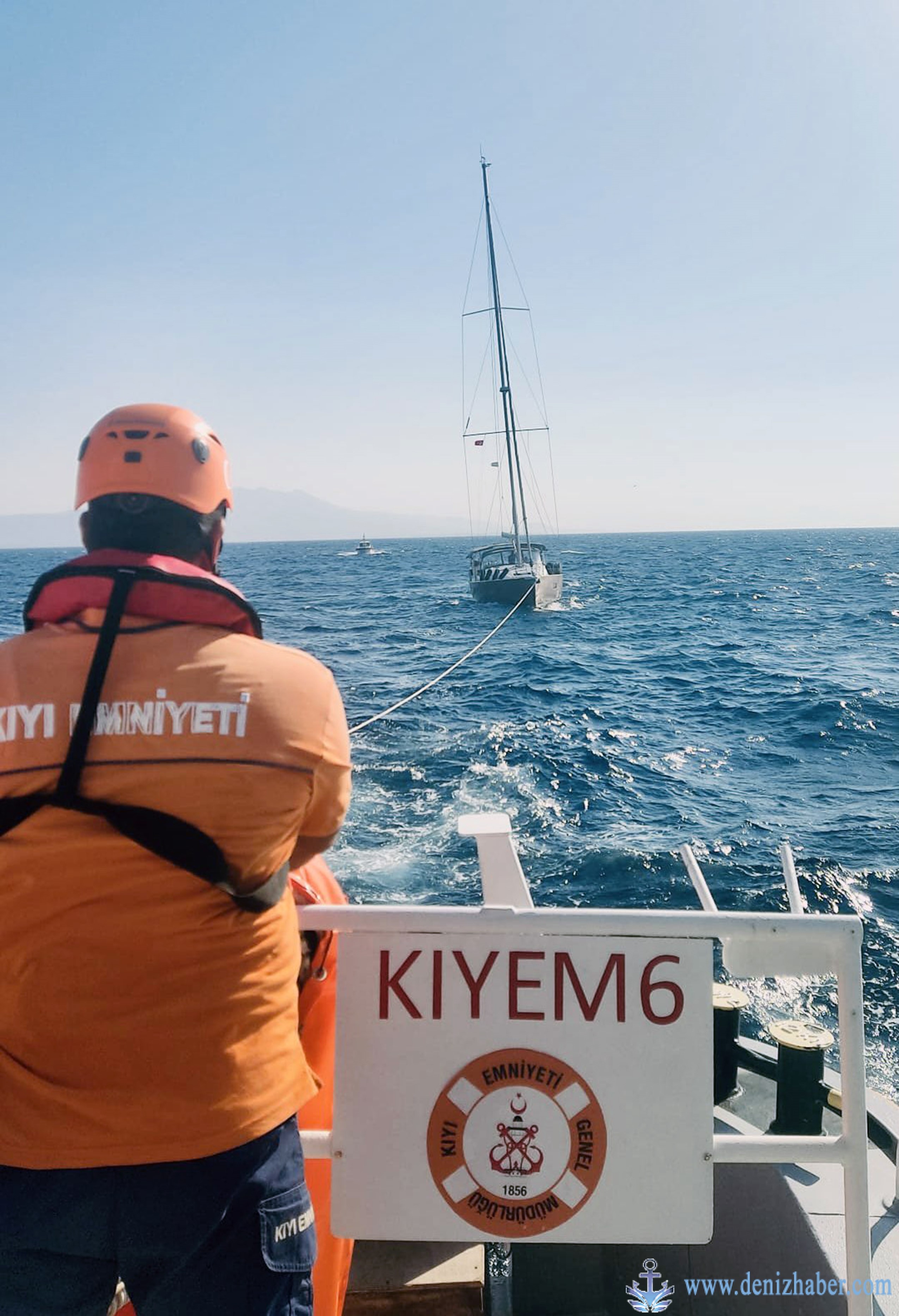 Bodrum Kargı Adası önlerinde makine arızası yapan ve sürüklenen 15 metre boyundaki tekne, KIYEM-6 hızlı tahlisiye (can kurtarma) botuna yedeklenerek Kumbahçe’ye emniyetle demirletildi.