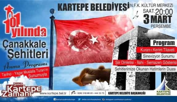 Kur’an-ı Kerim tilaveti ile başlayacak Çanakkale Şehitleri Anma Programında, Tarihçi Yazar Mustafa Turan’ın sunumuyla “Destanlaşan Çanakkale Sinevizyon Gösterimi” yer alacak. Serkan Aksan ve Vuslat Grubu’nun sahne alacağı program şiir dinletisi ve semazen gösterisi ile devam edecek. İlahilerin seslendirileceği program şehitlerin ruhuna okunan hatim duası ile sona erecek.