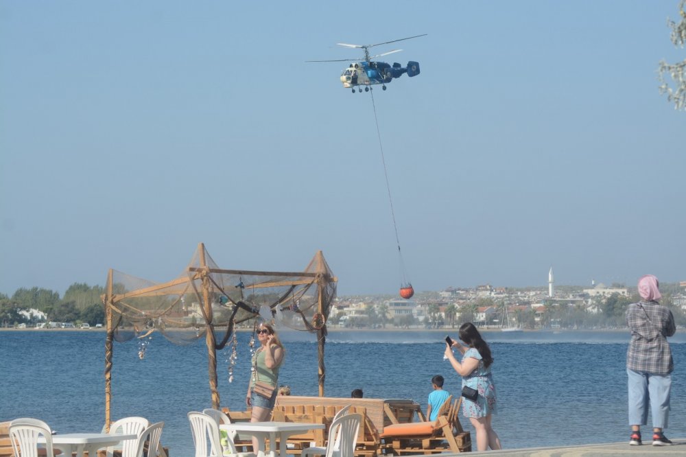 Görev yapan helikopterler tatil noktası olan Güre sahilinden su alırken, kumsalın ve güzelliği ve helikopterlerin can siperane mücadelesi aynı karelerde buluştu. Meraklı vatandaşlar olup biteni cep telefonları ile kaydetti.