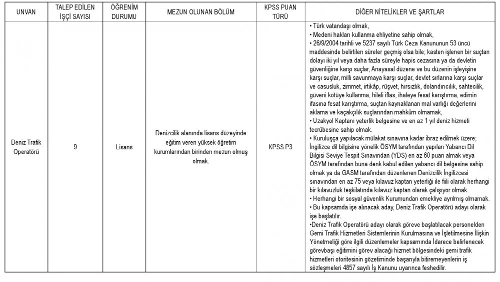 Kıyı Emniyeti Genel Müdürlüğü'nün denizcilik alanında lisans düzeyinde eğitim veren yüksek öğretim kurumlarından birinden mezun olmuş 9 işçi alacağı açıklandı.