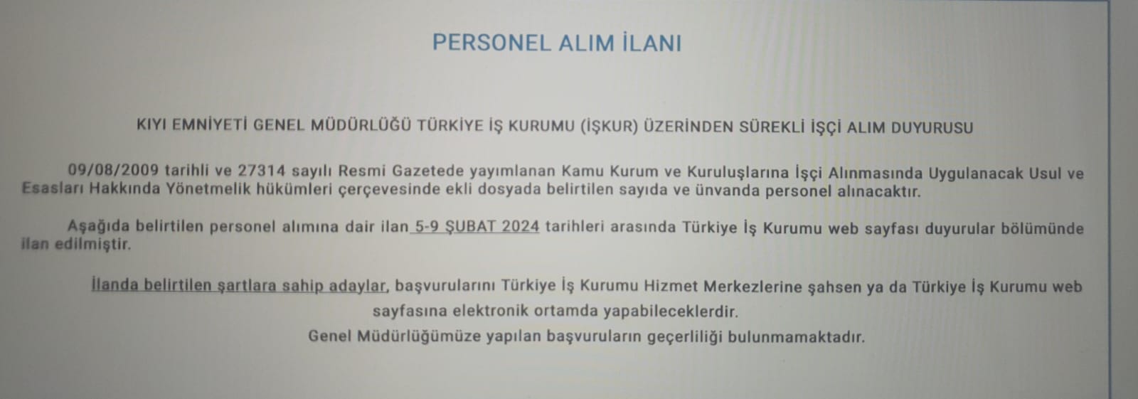 12 Kişilik Daimi İşçi Statüsünde Personel Alım Duyurusu İlanlara Başvurular Türkiye İş Kurumu Üzerinden Yapılacaktır.