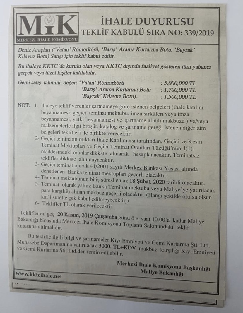 Kıbrıs Türk Kıyı Emniyeti Römorkör ve Botların satışı ihalesi yapıyor