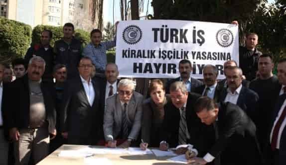 İnönü Parkı’nda masa kuran Türk-İş’e bağlı işçiler, Başbakanlığın TBMM’ye gönderdiği kiralık işçiliğin önünü açacak yasa tasarısına hayır demek için imza kampanyası başlattı.