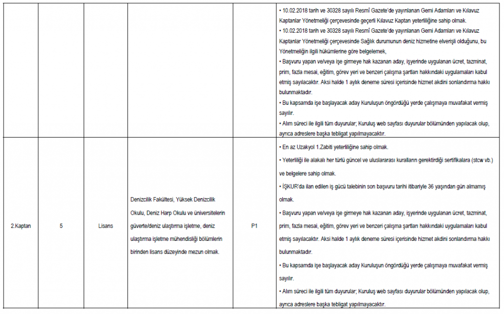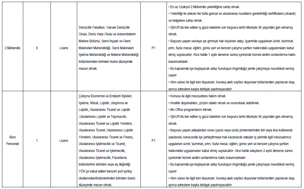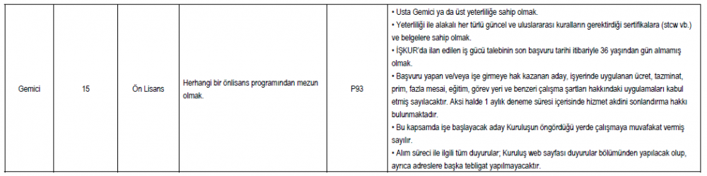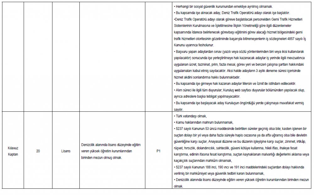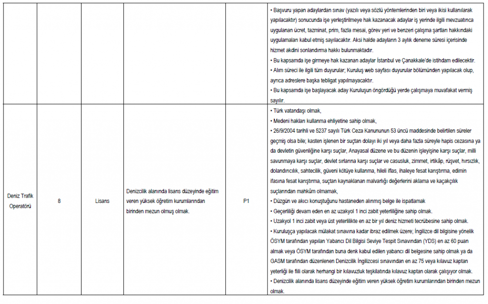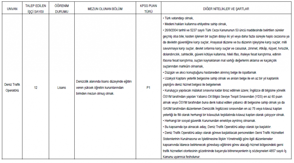 Kıyı Emniyeti Genel Müdürlüğü'nün açtığı ilanlar şöyle; 20 Deniz Trafik Operatörü, 20 Klılavuz Kaptan, 5 İkinci Kaptan, 6 İkinci Mühendis, 1 Büro Personeli, 15 Gemici.