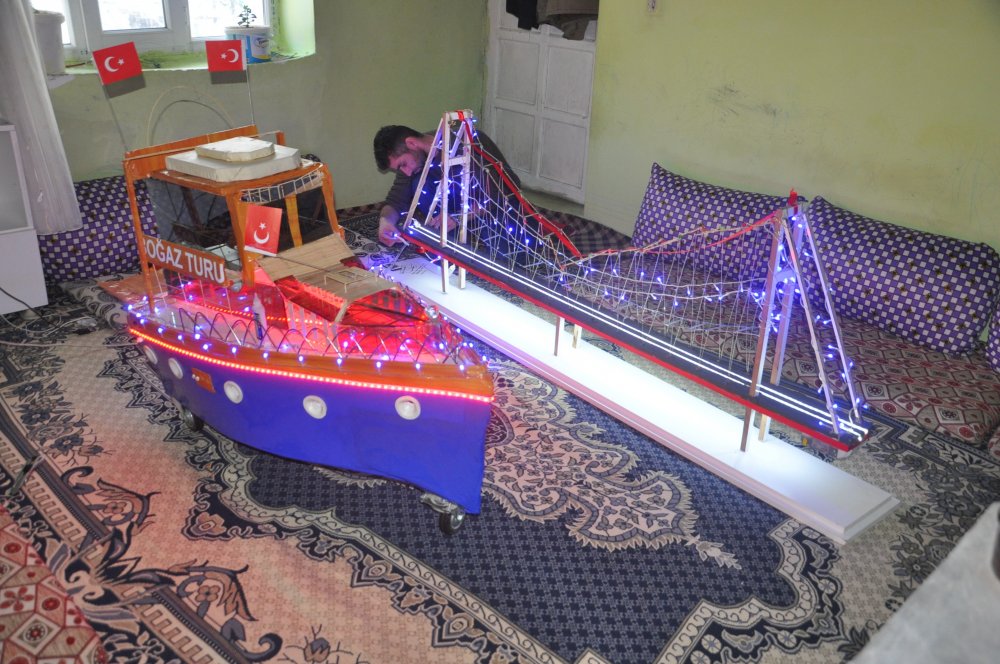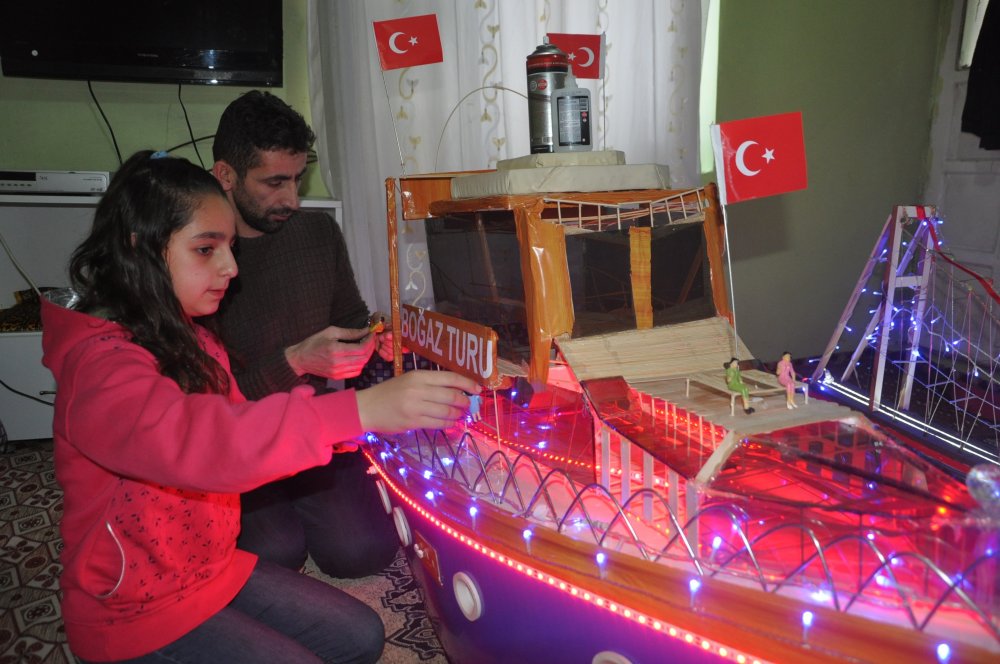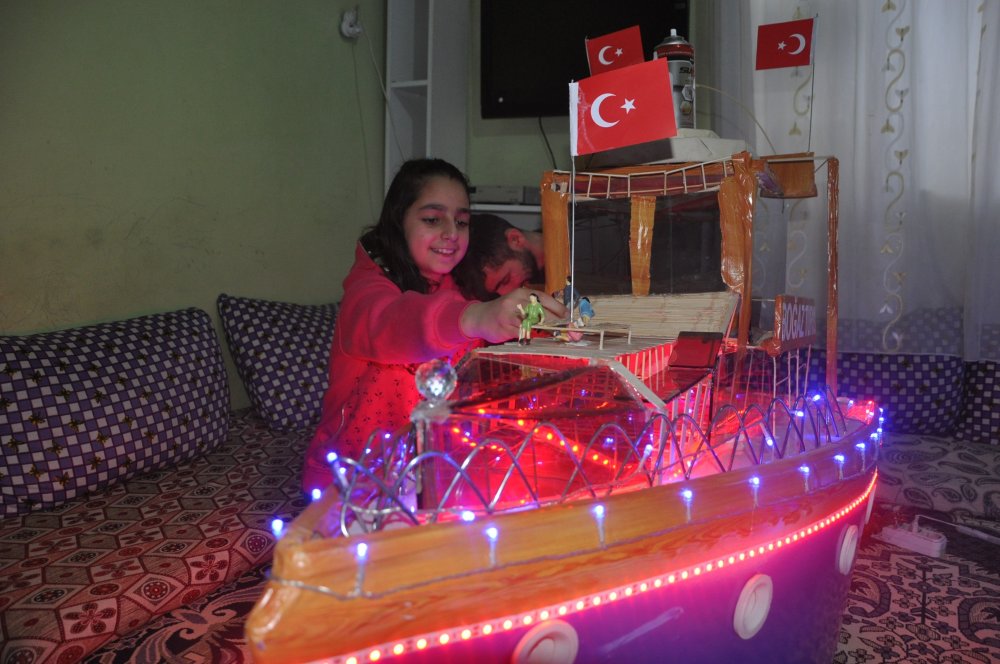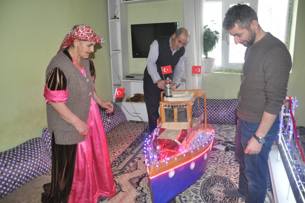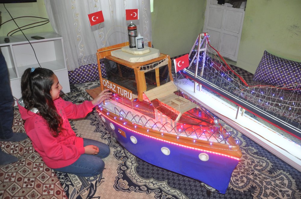 Hakkari'nin Yüksekova ilçesinde daha önce 15 Temmuz Şehitler Köprüsü'nü görmek isteyen kızı için köprünün maketini yapan Aydın Güder, şimdi de gemi maketi yaptı.