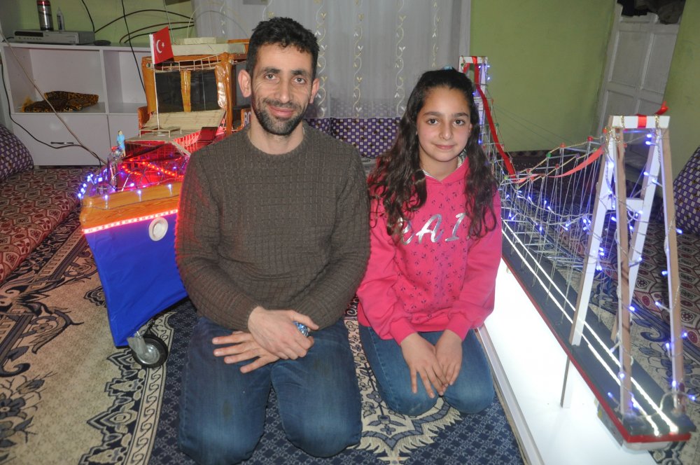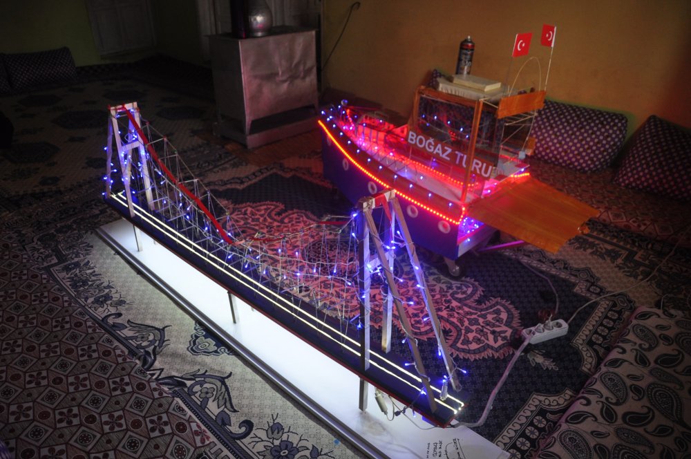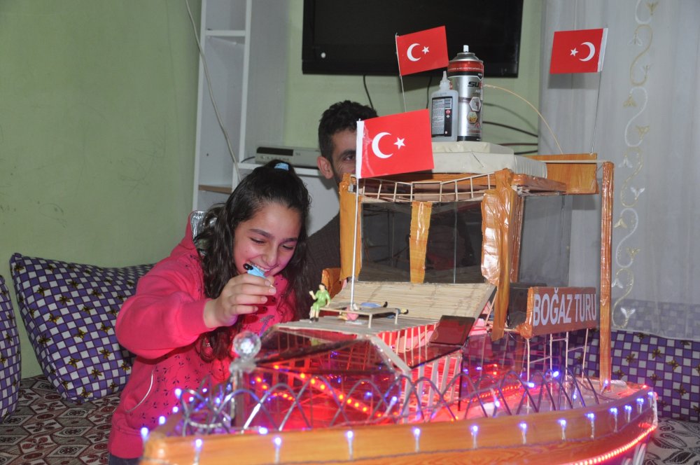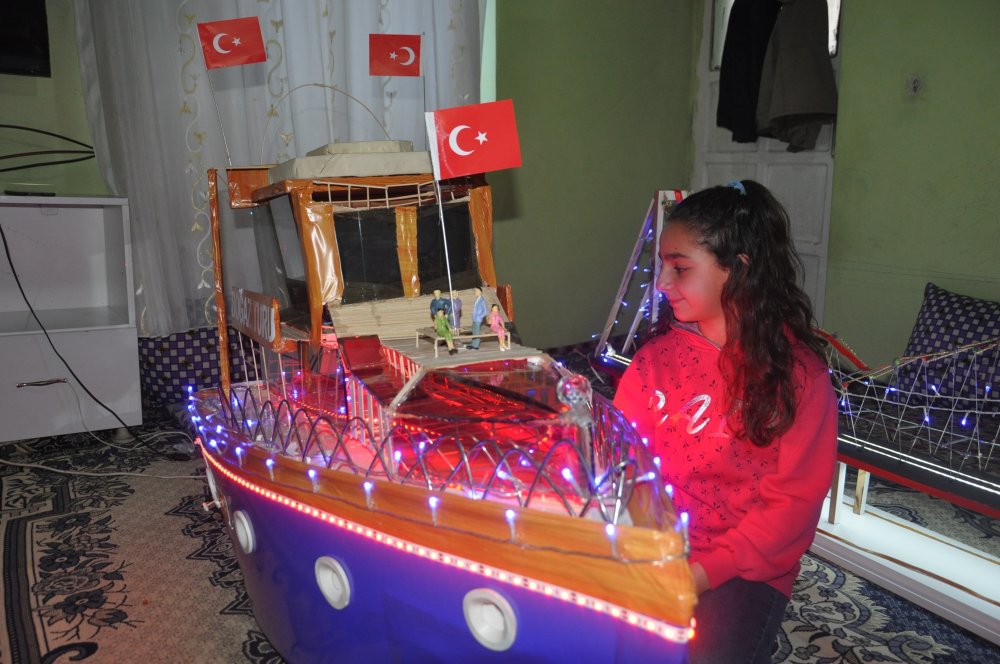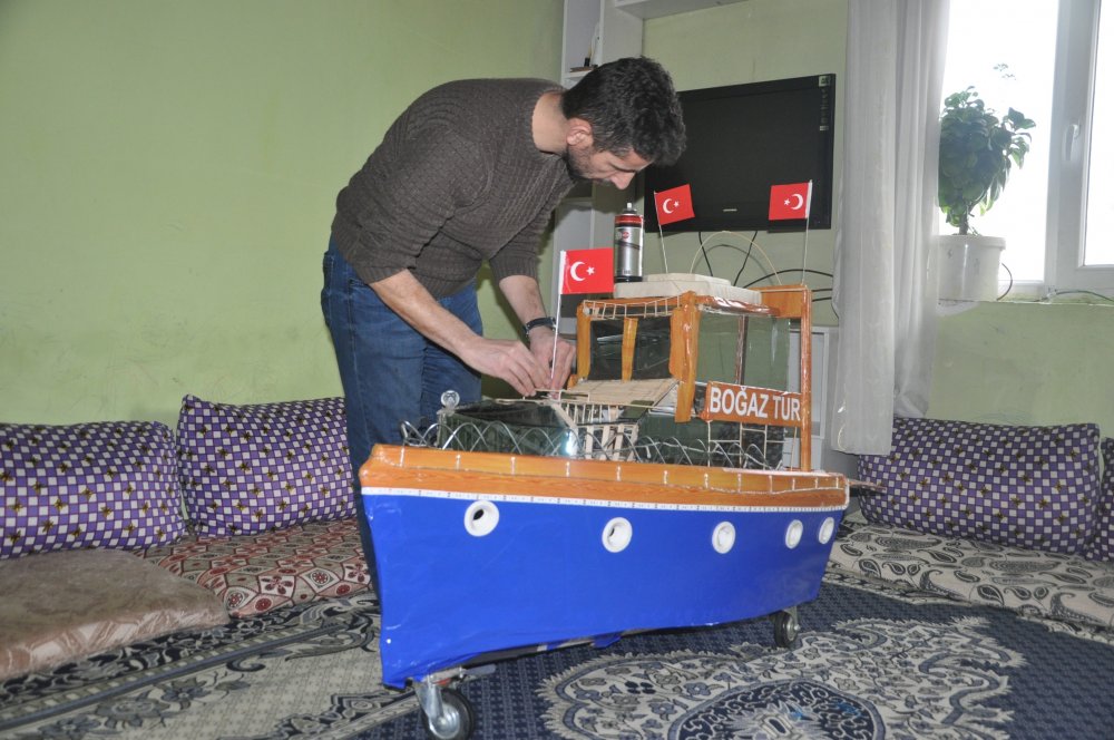 Hakkari'nin Yüksekova ilçesinde daha önce 15 Temmuz Şehitler Köprüsü'nü görmek isteyen kızı için köprünün maketini yapan Aydın Güder, şimdi de gemi maketi yaptı.