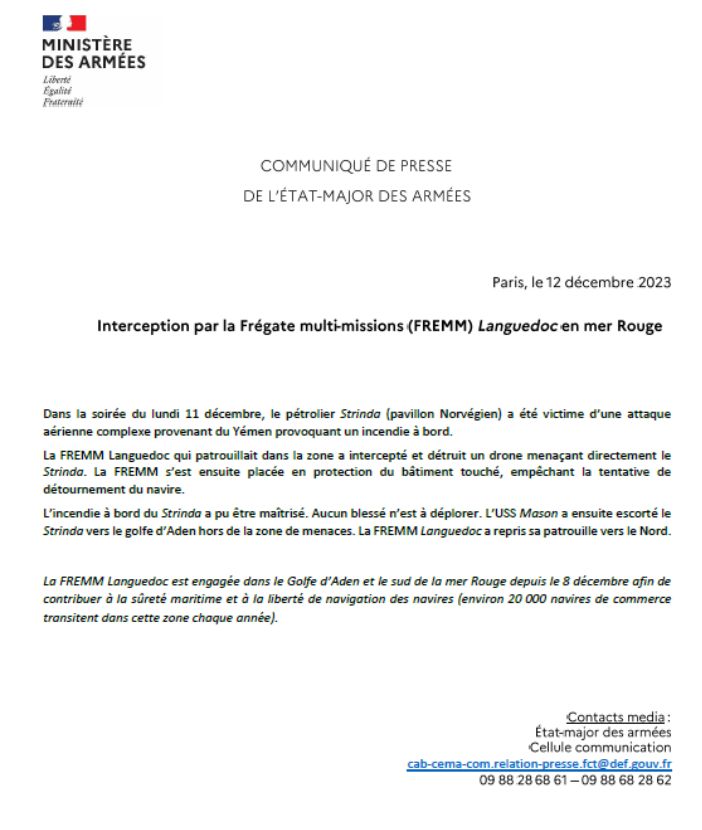 Fransız Donanması yaptığı açıklamada, 11 Aralık’ta Norveç Bayraklı kimyasal tanker, MT Strinda’ya yapılan saldırı hakkında yeni bilgiler verdi.