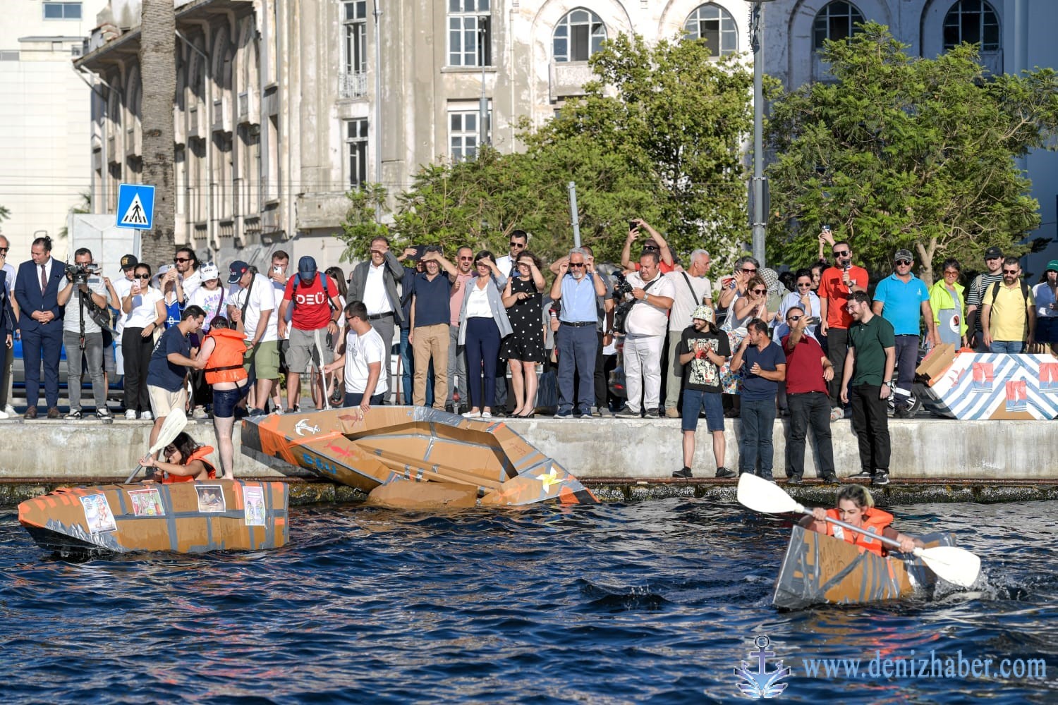 İzmirli mimar ve mühendislerin her yıl Kabotaj Bayramı’nda düzenledikleri “Kartondan Tekneler” yarışmasında heyecanlı dakikalar yaşandı. Bazı tekneler suya iner inmez batarken, iki tekne, kıyıdan yaklaşık 30 metre açıkta duran sahil güvenlik teknelerine kadar gidip tekrar kıyıya batmadan ulaştı.