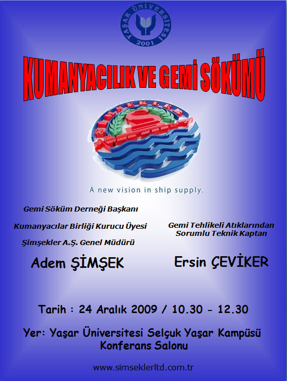 Yaşar Üniversitesi Lojistik Topluluğu tarafından 24 Aralık Perşembe günü saat saat 10:30-12:30 saatleri arasında, Yaşar Üniversitesi Selçuk Yaşar Kampüsü konferans salonunda "KUMANYACILIK VE GEMİ SÖKÜMÜ" konulu bir seminer düzenlenecek.
