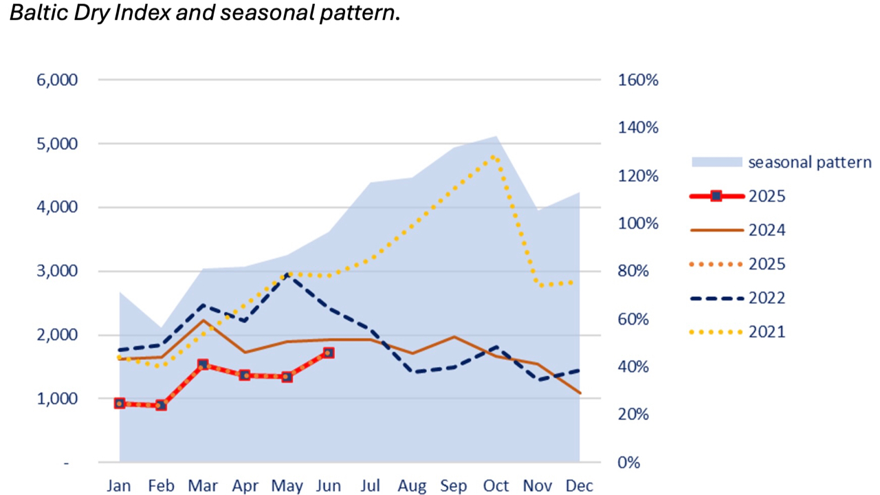 Haziran aylarında handysize segmentinde navlunlar genellikle artış gösterir. Bu yıl da beklendiği gibi oldu ve H7 ortalaması %11 artışla 11.224 dolara ulaştı. Capesize segmentindeki keskin yükselişin etkisiyle toplam Baltık Kuru Yük Endeksi (BDI), 20 Haziran itibarıyla 30 günde %26 artarak 1.689 puana çıktı. Haziran genelinde 1.721 puan olan ortalama ise, geçen yıl Ağustos ayında görülen 1.925 puandan bu yana en yüksek seviye olarak kayıtlara geçti.