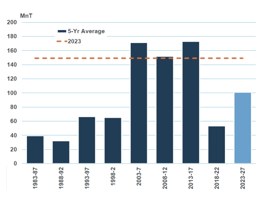Toplamda MSI, kuru dökme yük ticaretinin bu yıl 150 milyon tonun biraz altında artacağını tahmin ediyor; bu da 2000 sonrası patlama yıllarındaki ortalama büyümeyle aynı seviyede (tabloya bakınız).