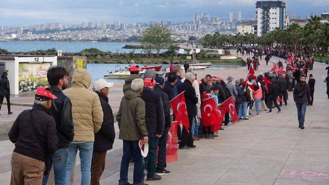 Samsun’un Atakum ilçesinde, Ekrem İmamoğlu’nun tutukluluğunun 55. gününde "Adalet Zinciri" etkinliği gerçekleştirdi. Kurupelit Yat Limanı’nda toplanan vatandaşlar, el ele tutuşarak insan zinciri oluşturdu.