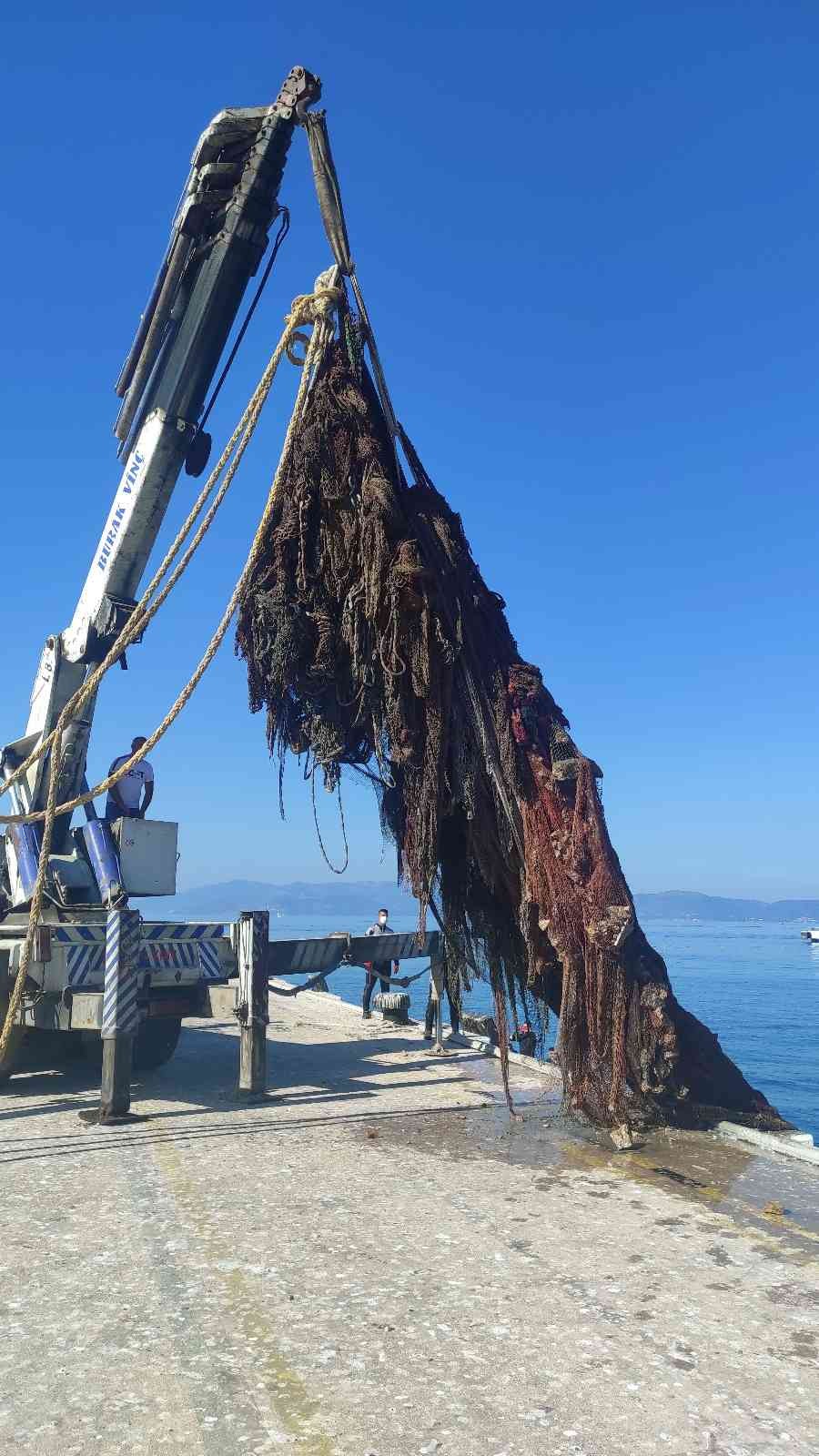Aydın'ın Kuşadası ilçesinde Güvercinada'nın kuzey yakasında 10 ton ağırlığındaki hayalet ağ denizden parça parça çıkarılıyor.