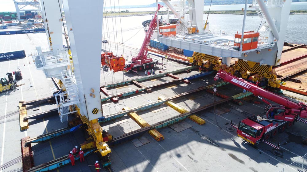 Liman başkanlığının verdiği detaylara göre, vinçlerin indirilmesi için gemiden rıhtıma geçici raylar yerleştirildi ve ardından vinçler güvenli bir şekilde limana indirildi.