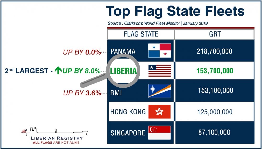 2018 yılında %8 ile dünyada en hızlı büyüyen bayrak olan Liberya Clarksons tarafından yapilan araştırma neticesinde 1 Ocak 2019 tarihi itibariyle dünyadaki 2. En büyük bayrak olarak tescil edilmiştir. Kalite anlamımda dünyanın lider Bayrağı olan Liberya büyümeye devam etmektedir.