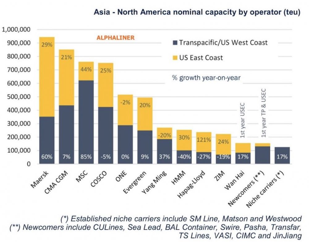 İncelemeden elde edilen diğer önemli çıkarımlar arasında, küresel deniz taşımacılığı şirketlerinin bağımsız hizmetleri başlatma kararlarının yanı sıra birçok yeni şirketin pazara girişinin bir sonucu olarak, üç büyük ittifakın (2M, THE Alliance, and Ocean Alliance) transpasifik üzerindeki ortak pazar payının %82,2'den %67,7'ye düştüğü istatistiği yer aldı.