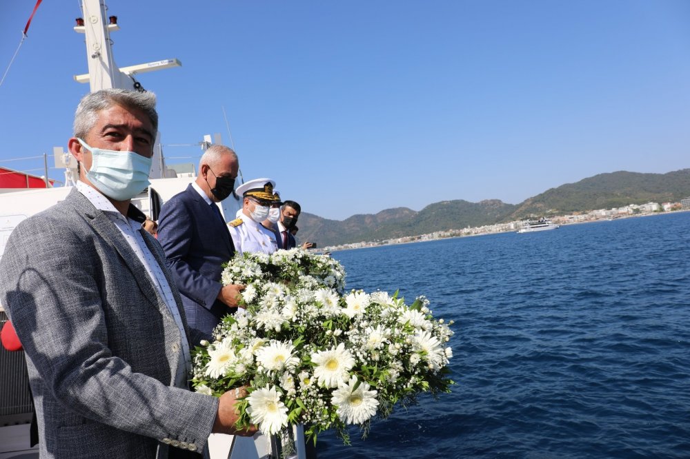 Marmaris Liman Başkanı Kurban'ın Atatürk Anıtı'na çelenk koymasının adından Ulu Önder Mustafa Kemal Atatürk ve deniz şehitleri anısına saygı duruşunda bulunuldu, İstiklal Marşı okundu. Ardından Marmaris Kaymakamı Ertuğ Şevket Aksoy, Aksaz Deniz Üs Komutanı Tuğamiral İbrahim Kurtuluş Sevinç, Marmaris Belediye Başkanı Mehmet Oktay, Marmaris Liman Başkanı Altuğ Kurban, Sahil Güvenlik botuyla körfeze açılarak deniz şehitleri anısına denize çiçek bıraktı. Bu sırada, ilçede faaliyet gösteren su sporları merkezlerinin çalışanları, jet skilerle gösteri yaptı.