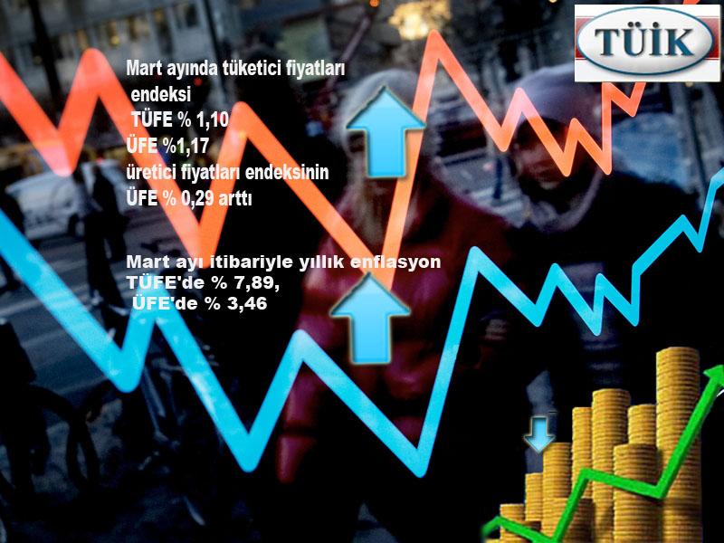Mart ayında tüketici fiyatları yüzde 1,10, üretici fiyatları ise 0,29 arttı. Yıllık enflasyon ise TÜFE'de 7,89 oldu.