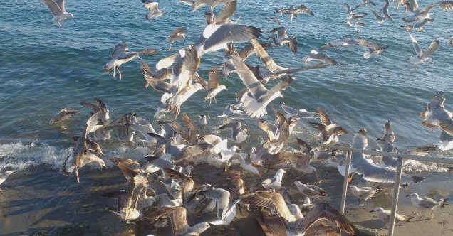 Tekirdağ’da martılar için kıyıya bırakılan yaklaşık 50 kilogram balık artığı 2 dakikada tükendi.